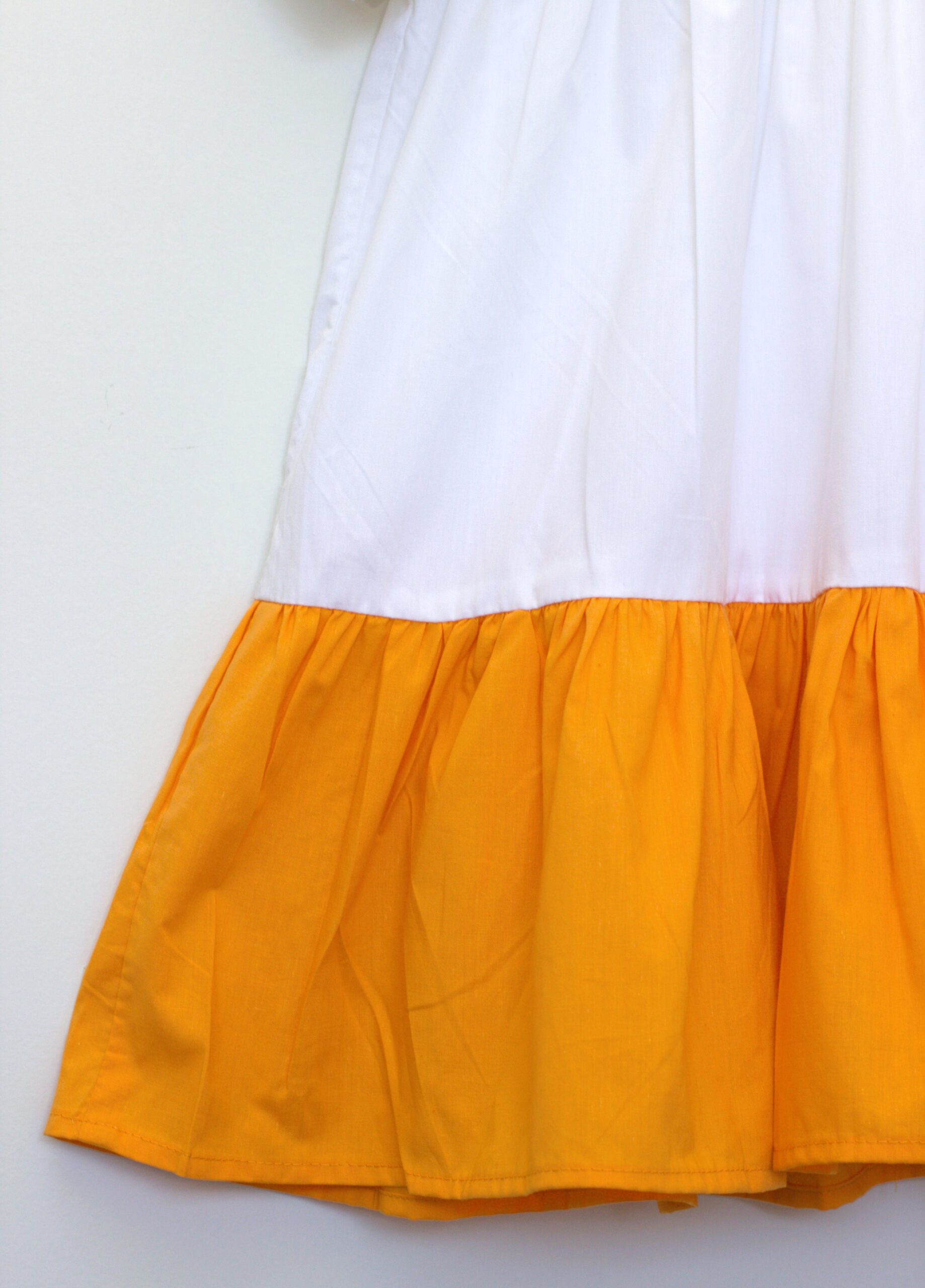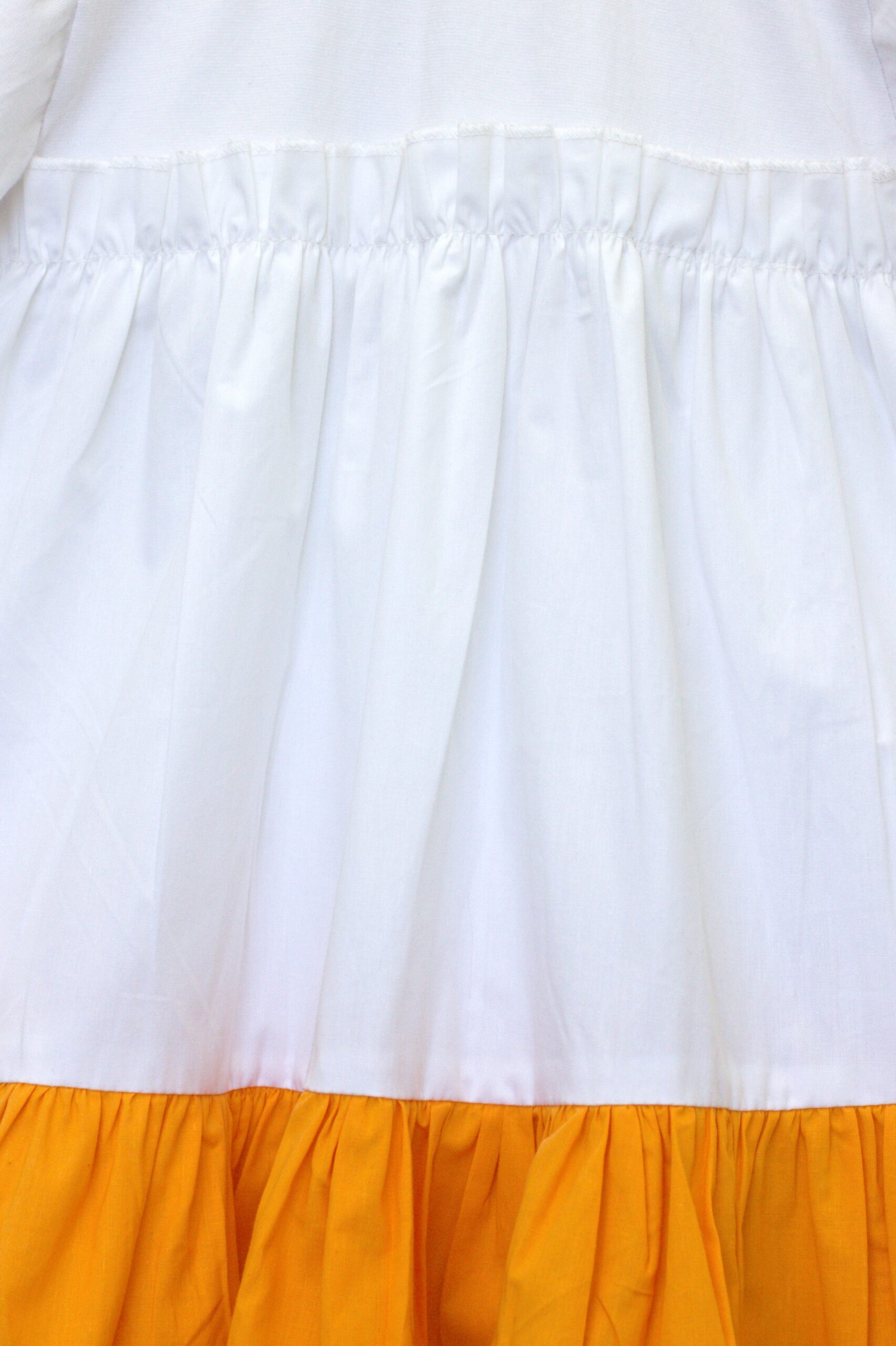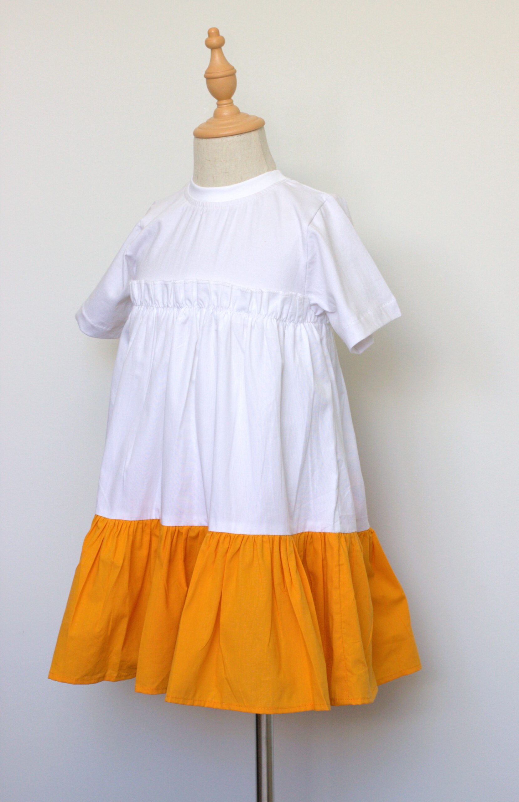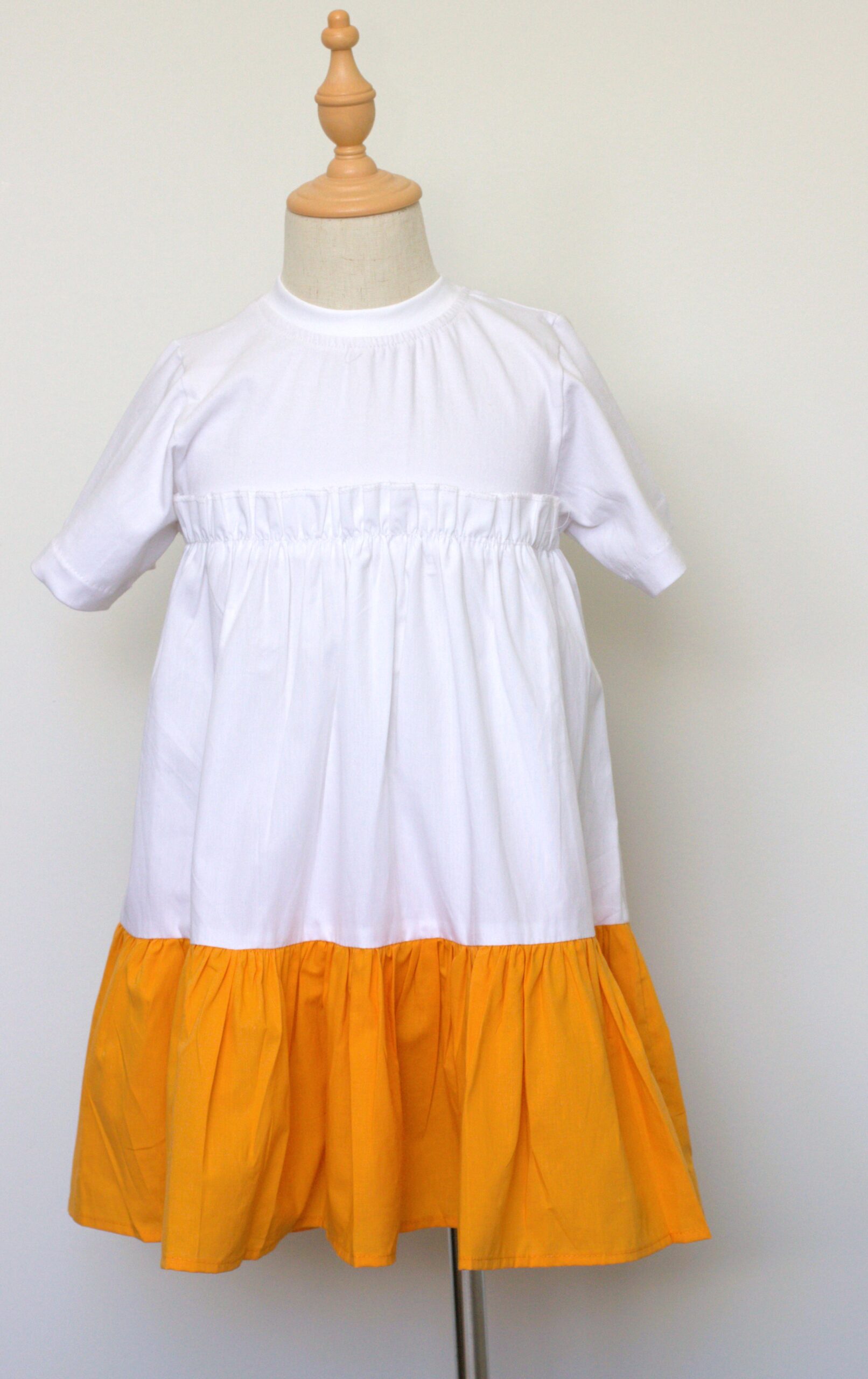 A soft and playful dress, perfect for everyday adventures. The top is crafted from skin-friendly Australian cotton jersey, while the skirt is made of 100% cotton with a cheerful mustard-yellow ruffle hem. Designed for comfort, movement, and effortless style.