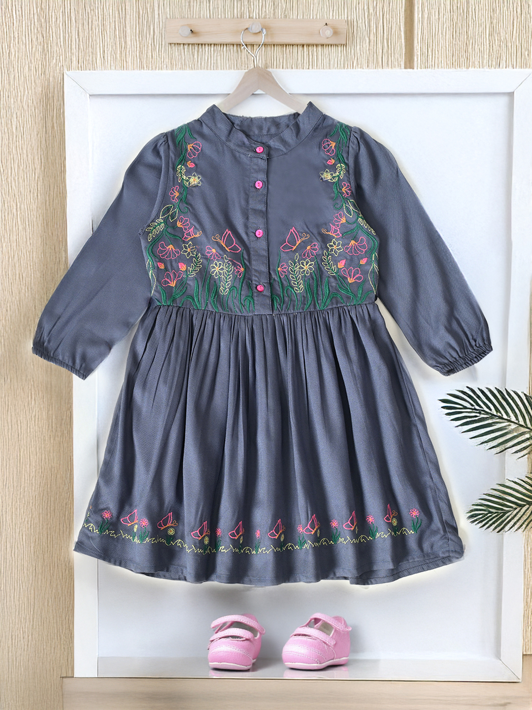 Embroidered Butterfly Dress- Grey