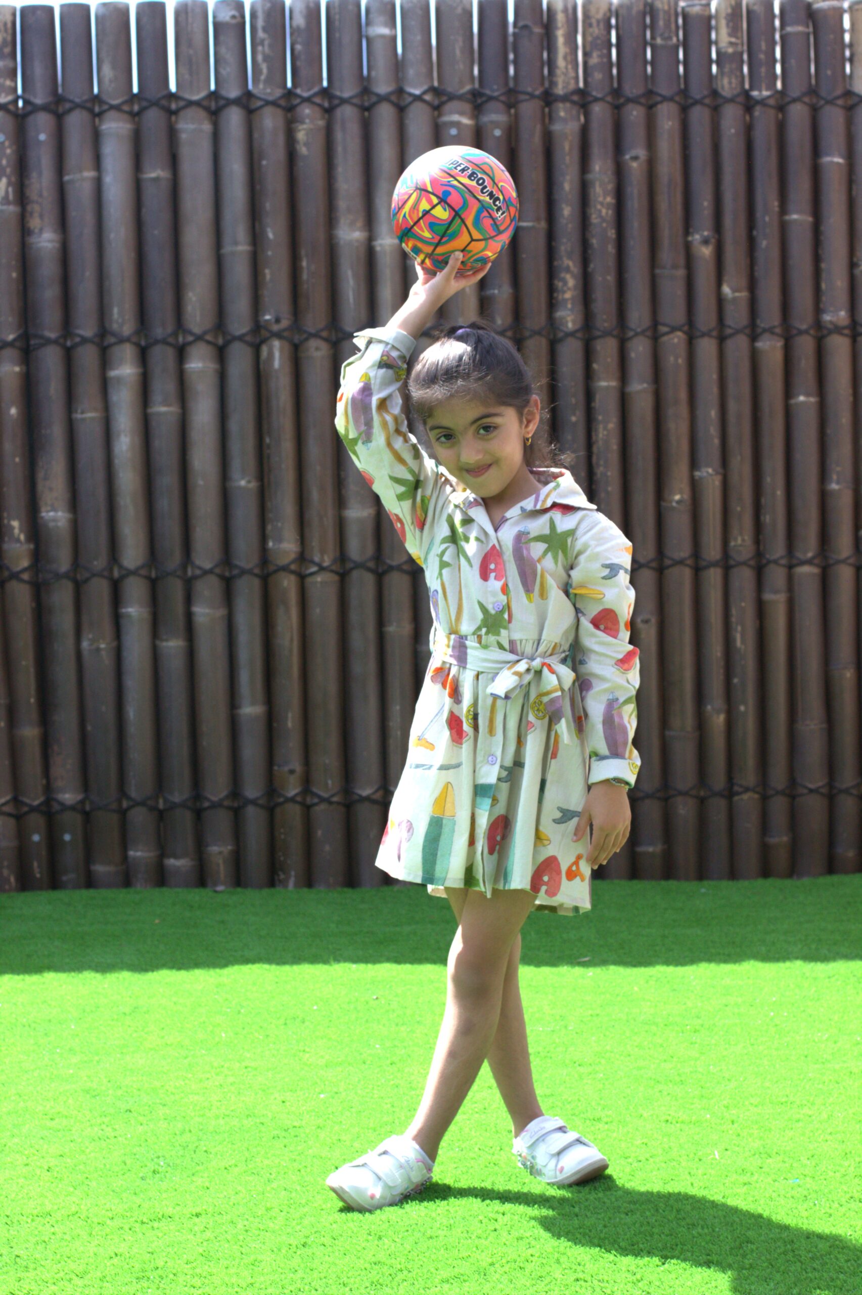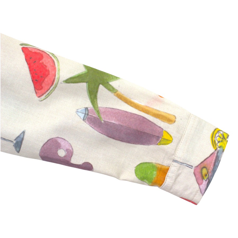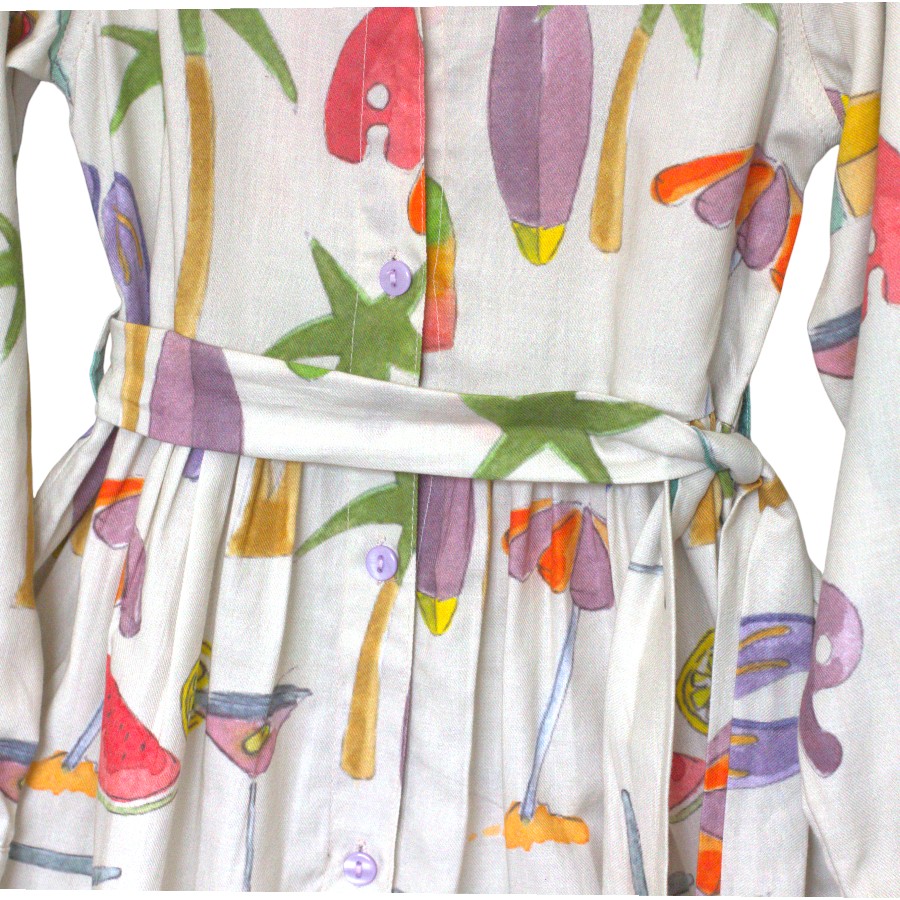 A fun and comfy shirt dress with colorful summer prints of palm trees, fruits, and surfboards. Made from soft fabric with long sleeves and a matching belt for the perfect fit. Easy to wear and great for everyday outings or playdates.